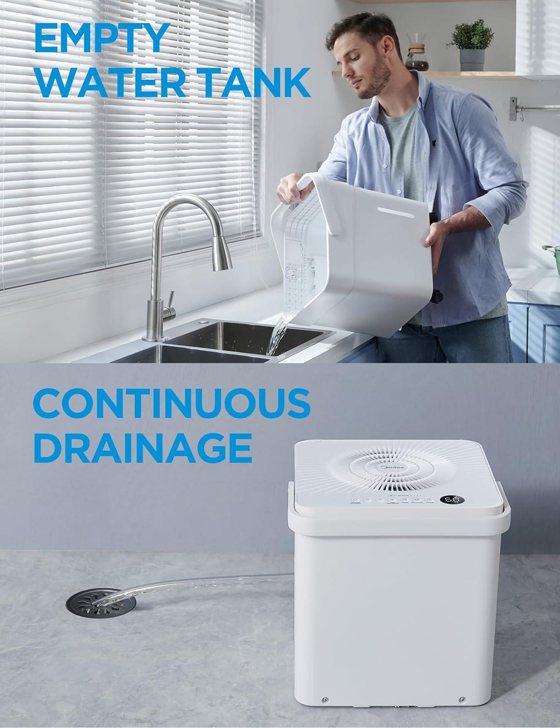 CONTINUOUS DRAIN OPTION – Versatile, no-bucket option provides more flexibility to remove moisture. You can remove the water tank and place the unit above the sink using the included drain hose, or position it over a floor drain, near a window or door.