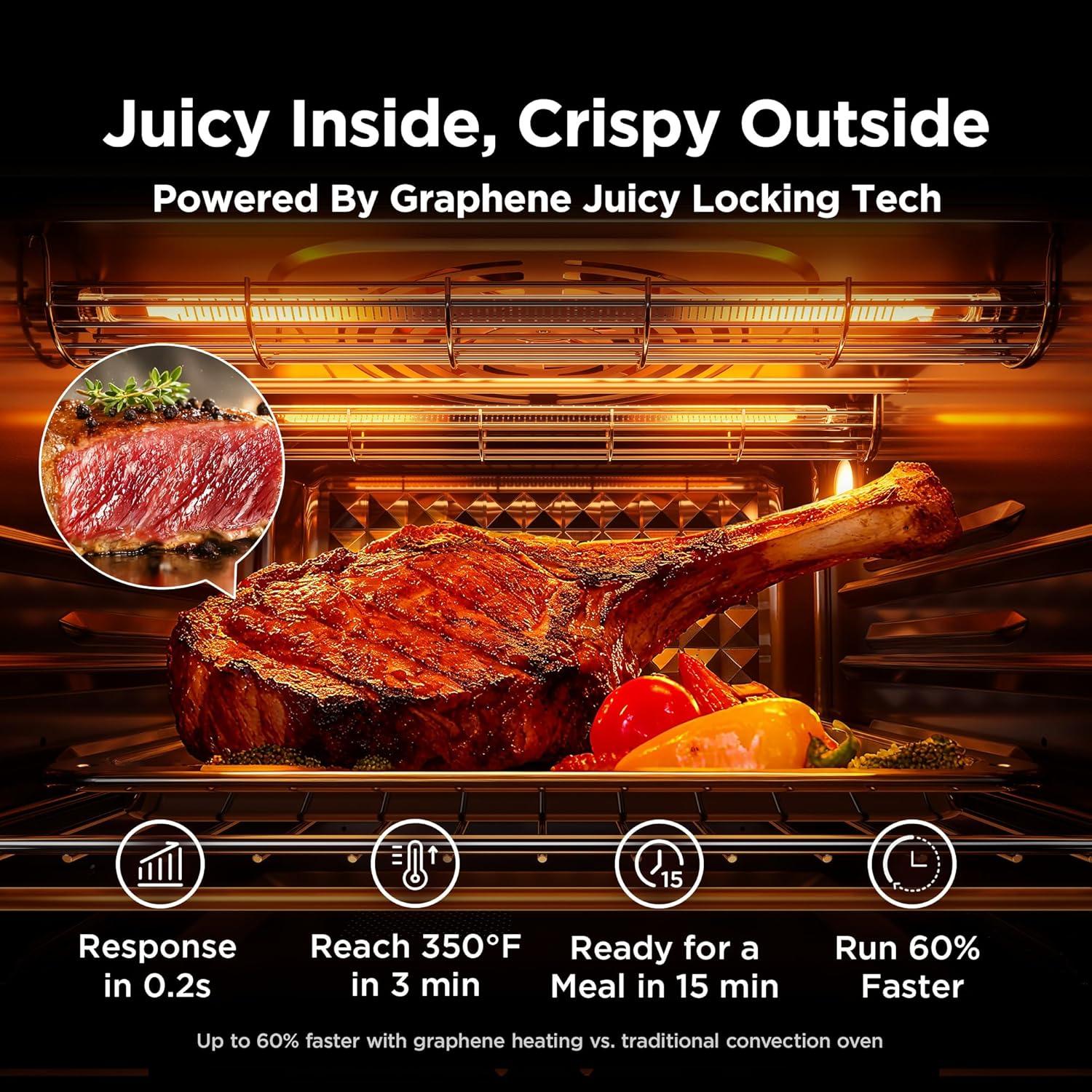 Graphene Rapid Heat: Advanced graphene tech delivers instant, even heat for crisp, juicy results—60% faster than traditional convection ovens. With 0.2s response, 3 mins to 350°F, and a 100–450°F range, Flexify ensures precise texture every time.