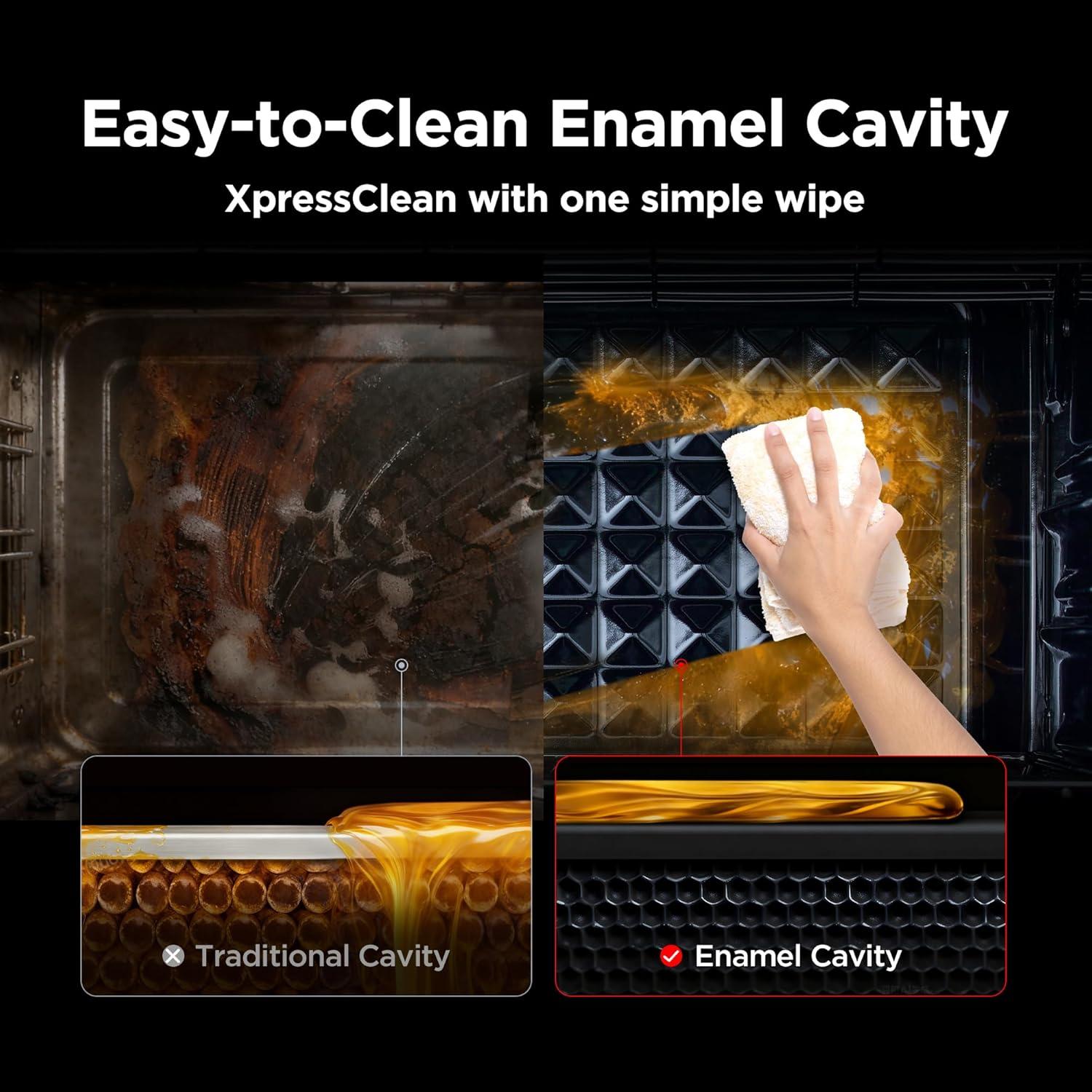 Premium Enamel Interior: Featuring our XpressClean enamel chamber and baking pan, the durable, grease-resistant surface wipes clean in seconds. Its long-lasting construction and PAFS-free design deliver a safer, healthier cooking experience.